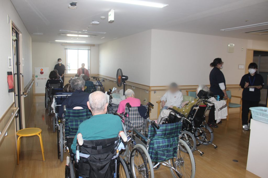 この訓練は消防避難訓練実施要領に基づき毎年実施しているもので、ご利用者様の安全確保を第一に考え、職員の防災意識の醸成と訓練による即応体制など確認しました。放送設備の使用方法ご利用者様の避難、いつ起こるか分からない災害に備える心構えについて再認識しました。